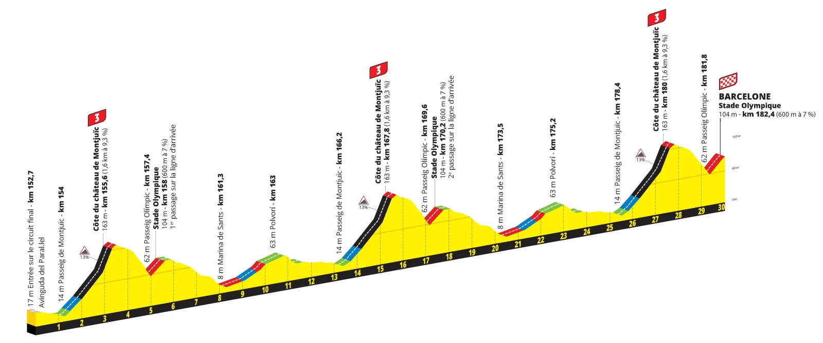 Tarragone, ville de 141 000 habitants et site archéologique classé au patrimoine mondial de l’UNESCO, offrira son cadre historique à l’envol d’une étape qui suivra d’abord la route littorale. La première moitié du parcours traversera plusieurs communes de la Costa Daurada, avec ses longues plages de sable fin et doré. Après Sitges, souvent comparée à Saint-Tropez espagnole, les cyclistes longeront un vaste littoral offrant de magnifiques panoramas sur la mer. La seconde partie de l’étape deviendra très vallonnée et exigeante à partir de la côte de Begues. La traversée de Barcelone conduira à un circuit final, tracé dans un parc verdoyant et dominé par la rude montée du château de Montjuïc (1,6 kilomètre, dont 600 mètres à 13 %), à escalader trois fois. Pour une arrivée en côte, identique à celle du chrono par équipe de la veille.